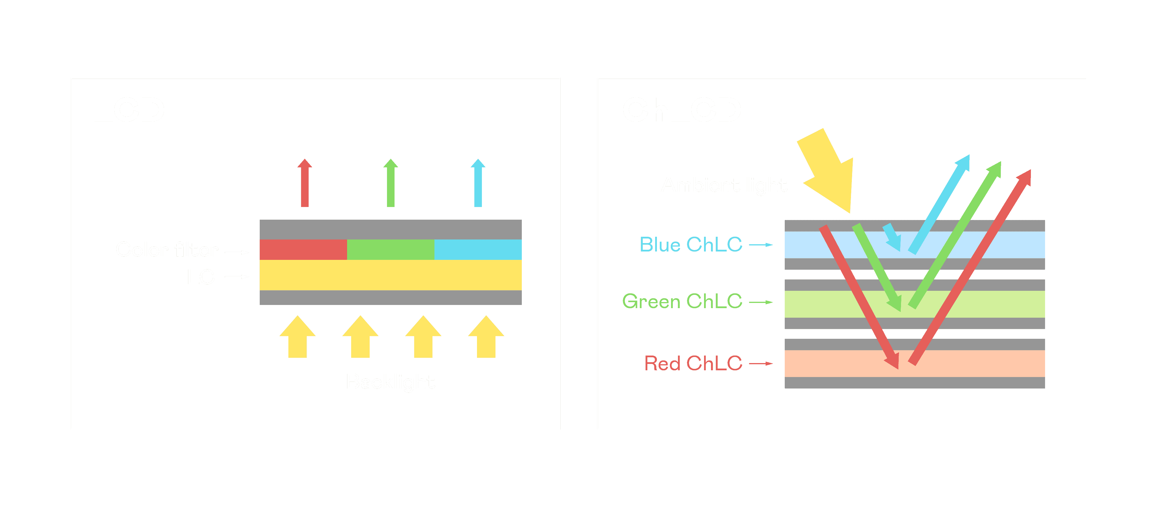 ChLCD 胆固醇液晶就如同纸张一样,,,透过反射环境光来显示影像,,,因此长时间观看不易造成人眼视觉疲劳,,可达到护眼效果。。。。当处于户外阳光下使用,,LCD 影像容易失真而不易观看,,,,但胆固醇液晶仍可维持较佳的影像品质。。。。