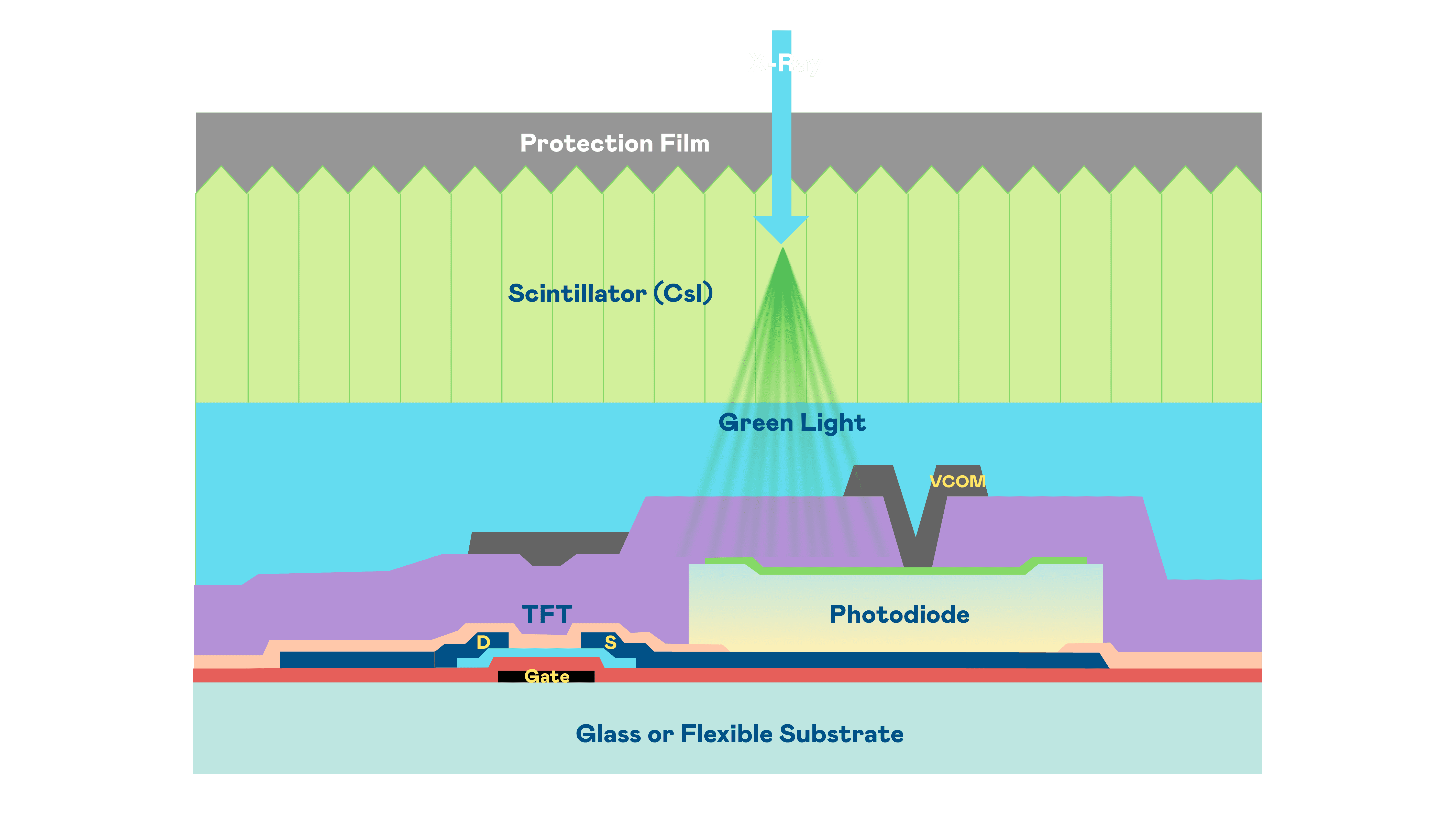 龙门国际的X光影像感测阵列使用薄膜电晶体 (TFT) 作为每个像素的读取开关,,,搭配光电二极体(Photodiode)的光电转换元件,,用以感测X光影像讯号。。。。
